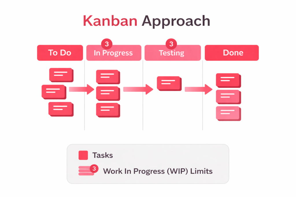 Lean thinking focuses on reducing waste and delivering only what creates value. Kanban is its most common expression in software: a visual board, limited work-in-progress, and continuous pull of tasks.