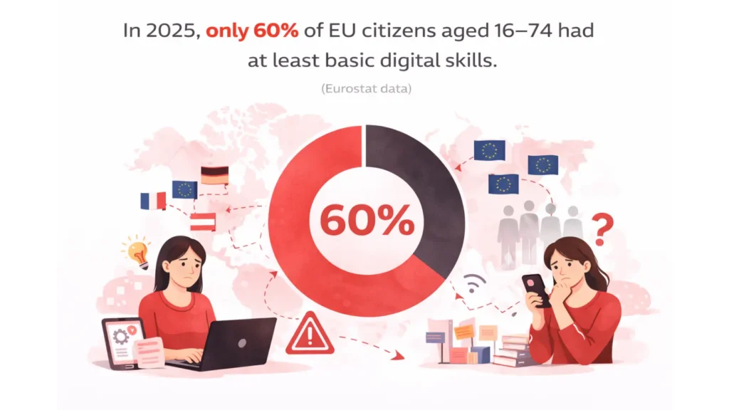 Also, capability isn’t evenly distributed. In 2025, only 60% of EU citizens aged 16–74 had at least basic digital skills. This is a useful reminder that “one training and done” isn’t a plan.